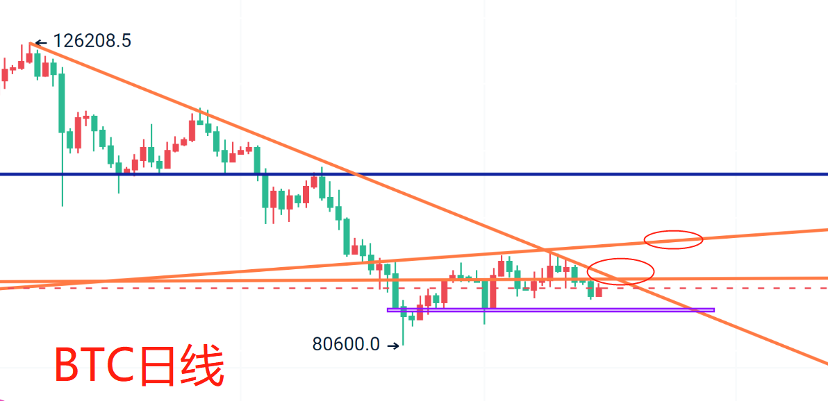 Looking at Bitcoin on both the weekly and daily charts, the overall candlestick structure has not changed significantly; it remains in a low-level box range adjustment. On the weekly chart, it is important to note that the closing price has not risen above 90,000, and the MACD double lines have fallen below the zero axis. On the daily chart, the Bollinger Bands are narrowing, and the moving averages are running around the middle track, indicating that we are approaching a turning point. Combined with the trend line's resistance pattern, I will provide my market forecast.