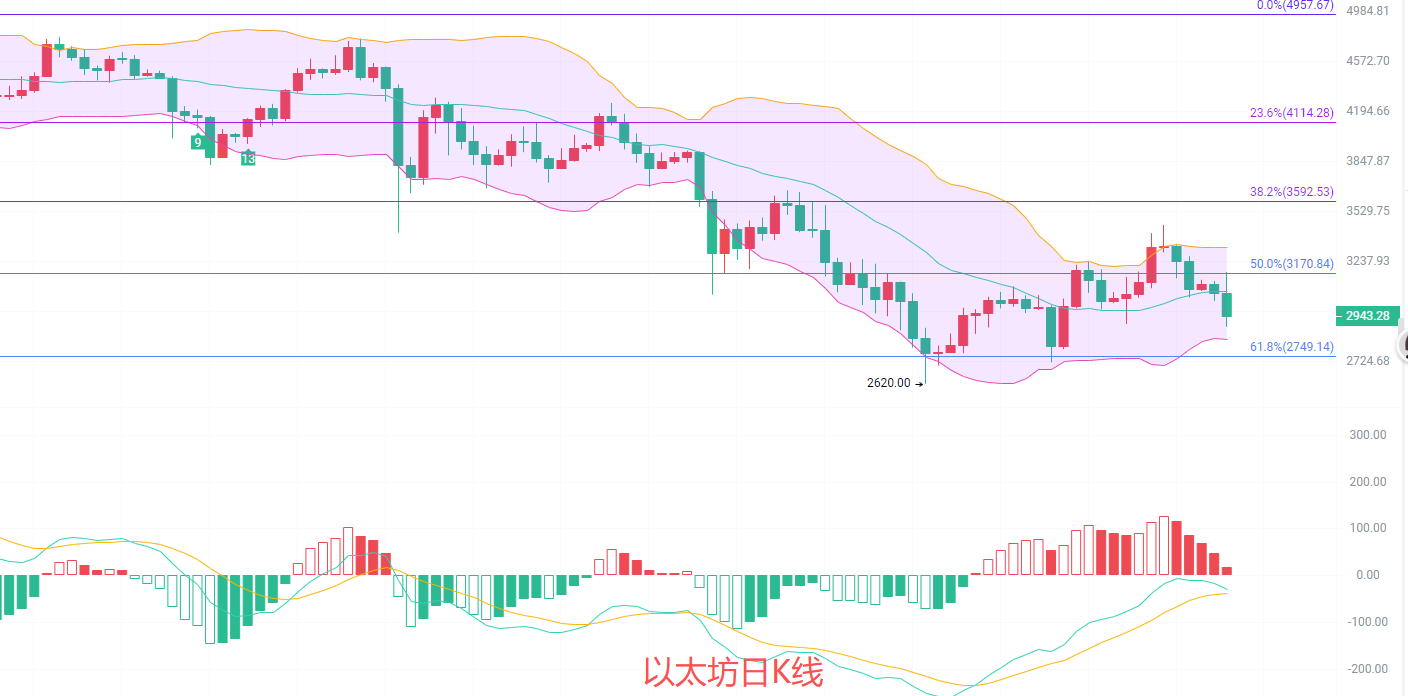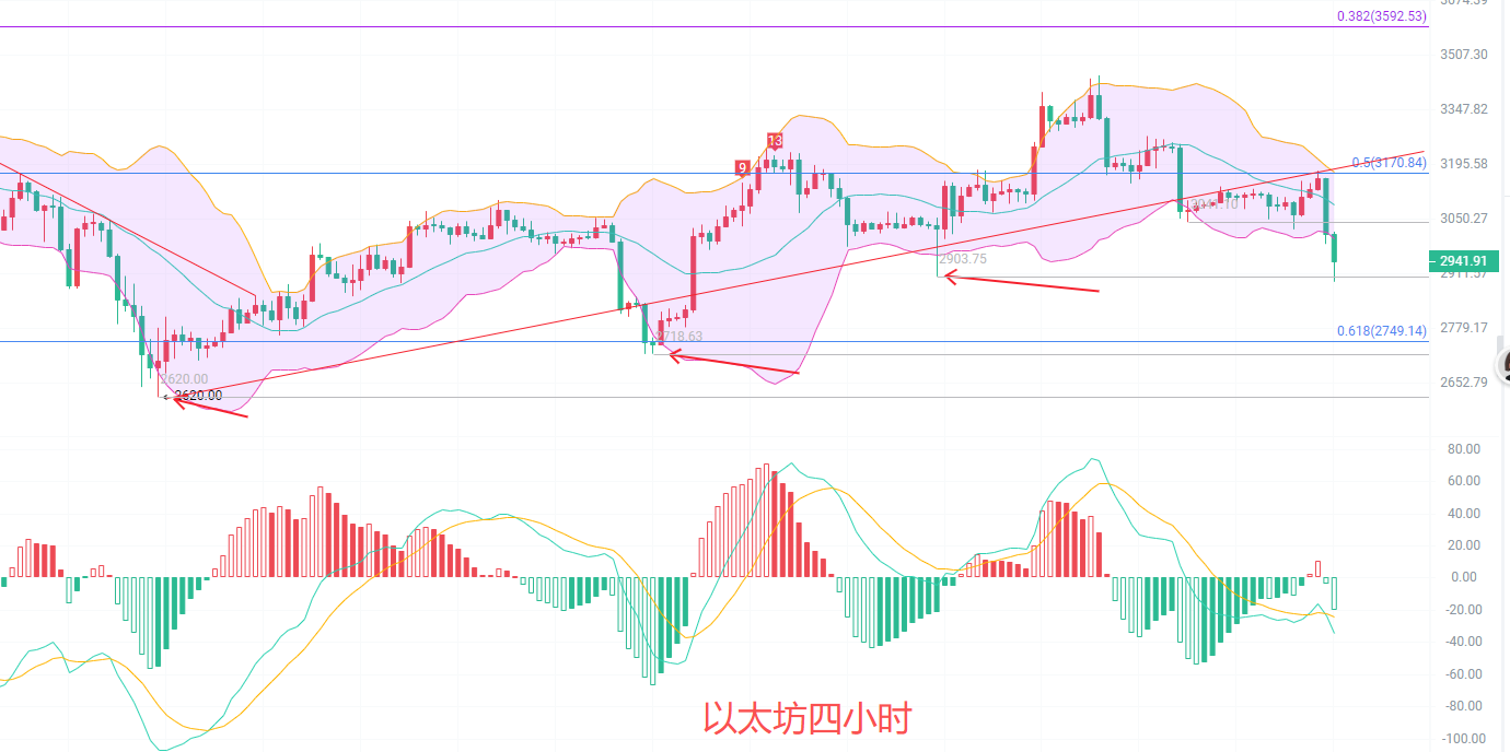 The four-hour K-line has broken below the previous low support at 2900. The MACD has also ended its volume increase and has reverted to a decreasing trend. The DIF and DEA golden cross has turned back into a death cross. The Bollinger Bands are contracting, and the lower band at 3000 has been lost. The K-line has deviated from the Bollinger Band channel and is spreading outward. The market is likely to return to the 3000 level for consolidation. The deviation from the Bollinger Band channel, combined with the market entering an extreme oversold sequence, indicates a need for a pullback. Therefore, the upward movement should be a quick line. If the market further dips below 2830, consider whether to stop loss and exit.