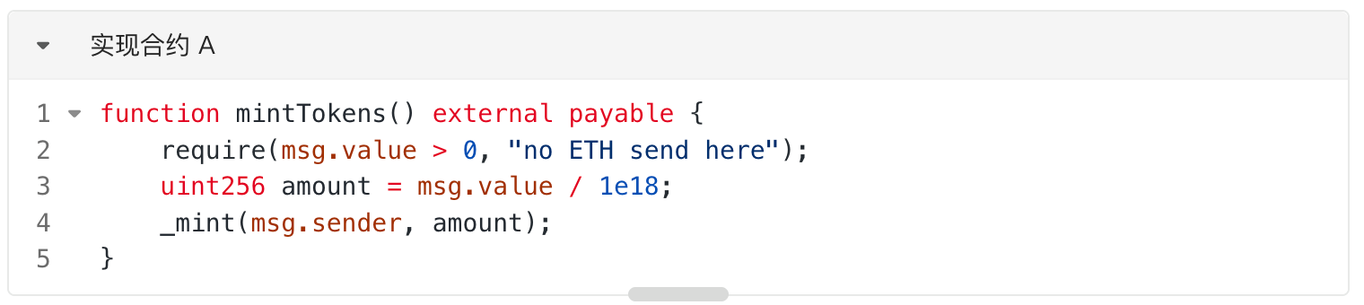 1. On the Ethereum Sepolia testnet, the project team (EOA) deployed an implementation contract, assuming the main function of this contract is for users to deposit ETH to mint corresponding ATokens, as shown in the mintTokens function code. It is important to note that there is no function in A that can directly withdraw ETH.