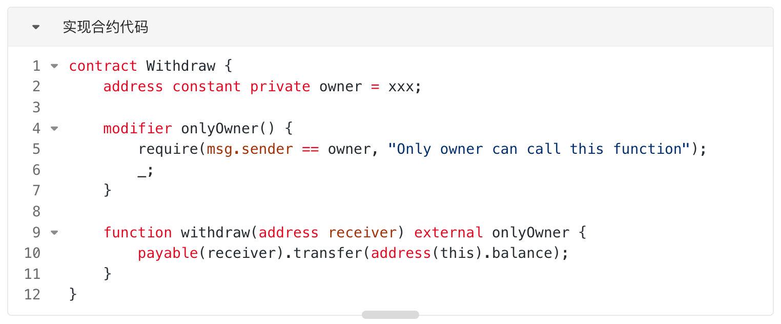 2. Deploy the same implementation contract at the mainnet with address A as on the testnet. As mentioned in the #Minimal Proxy Contract (Clones)# section, the address of the proxy contract calculated by the cloneDeterministic function is related to the salt and implementation contract address, and is independent of the bytecode of the implementation contract. Therefore, we only need to deploy a contract at address A, and the specific content of the contract does not affect the calculation of the proxy contract address. We can directly deploy a contract with the function to withdraw ETH at address A, as shown in the code below.