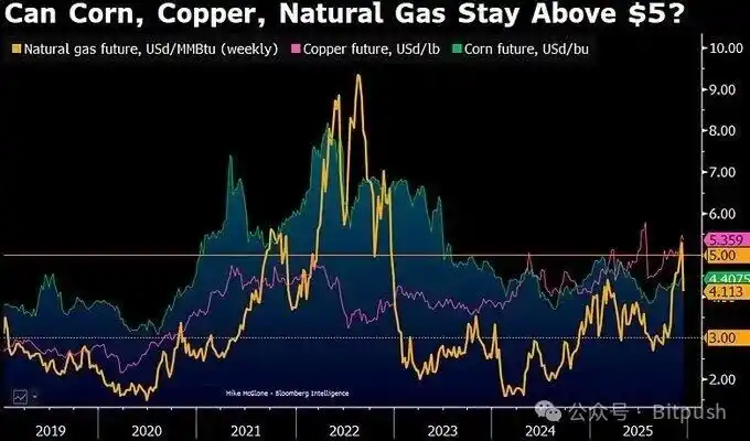 He pointed out that by around 2026, commodity prices may fluctuate around a key central axis—the "inflation-deflation dividing line" for core commodities like natural gas, corn, and copper may fall near 5 USD, and among these commodities, only copper, which has real industrial demand support, may still stand above this axis by the end of 2025.