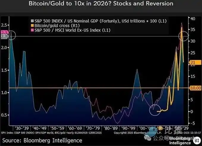 Second, it is the relative pricing relationship between Bitcoin and gold. McGlone particularly emphasizes the Bitcoin/gold ratio. This ratio was about 10 times at the end of 2022, then rapidly expanded under the bull market, reaching over 30 times in 2025. However, since the beginning of this year, this ratio has fallen by about 40%, down to around 21 times. In his view, if deflationary pressures persist and gold remains strong due to safe-haven demand, then a further return to historical ranges for this ratio is not an aggressive assumption.