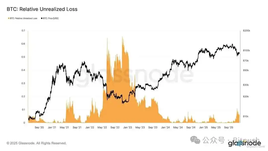 Research from Glassnode indicates that Bitcoin's fluctuation range between 80,000 and 90,000 USD has put pressure on the market, with the intensity of this pressure comparable to the trend at the end of January 2022. The current market's relative unrealized losses are approaching 10% of market capitalization. Analysts further explain that such market dynamics reflect a state of "liquidity constraints and sensitivity to macro shocks," but have not yet reached the level of typical bear market complete sell-off (panic liquidation).