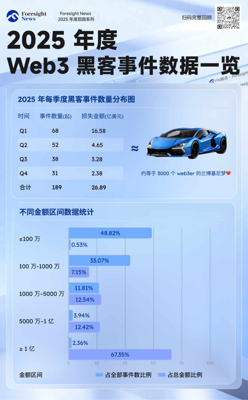 Looking back from the end of 2025, if we only consider the candlestick charts, this year's story seems to be the familiar cycle of bull and bear markets, with fluctuations. However, behind the price curves lies another more thrilling trajectory. This year, hackers' hunting became more precise and deadly. According to incomplete statistics from SlowMist's blockchain hacking archive and other online sources, as of December 15, there were 189 on-chain and crypto-related security incidents throughout the year, with total losses reaching approximately $2.689 billion.