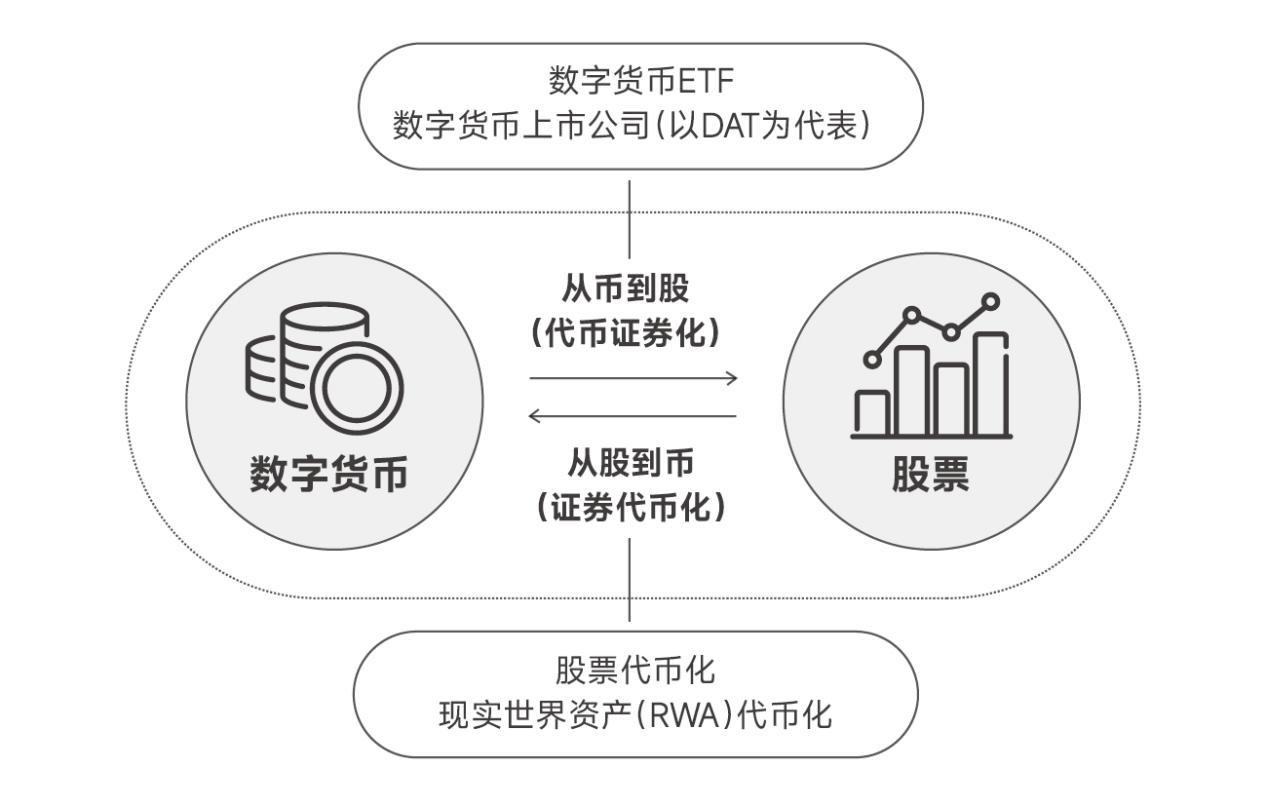 Using the two main lines of securities tokenization and token securitization, this transformative picture is clearly depicted: on one hand, traditional securities such as stocks and bonds are beginning to go on-chain, registered, settled, and traded in the form of tokens; on the other hand, digital currencies like Bitcoin and Ethereum are being incorporated into mainstream capital markets through compliant vehicles such as ETFs and DAT companies, becoming an important part of institutional asset allocation and corporate balance sheet restructuring.