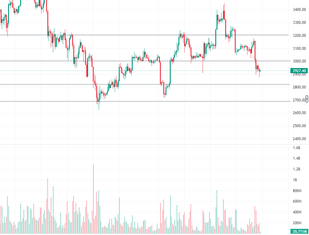 ETH短期 支撑:2900,2830 阻力: 3000,3150