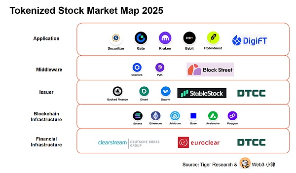 根据 Tiger Research 预计,目前代币化股票市场规模为 5 亿美元,但如果全球仅 1%的股票实现代币化,到 2030 年该市场规模可能达到 1.34 万亿美元。这代表着潜在的 2680 倍增长,增长动力来自 2025 年监管清晰度和基础设施成熟度的双重提升。