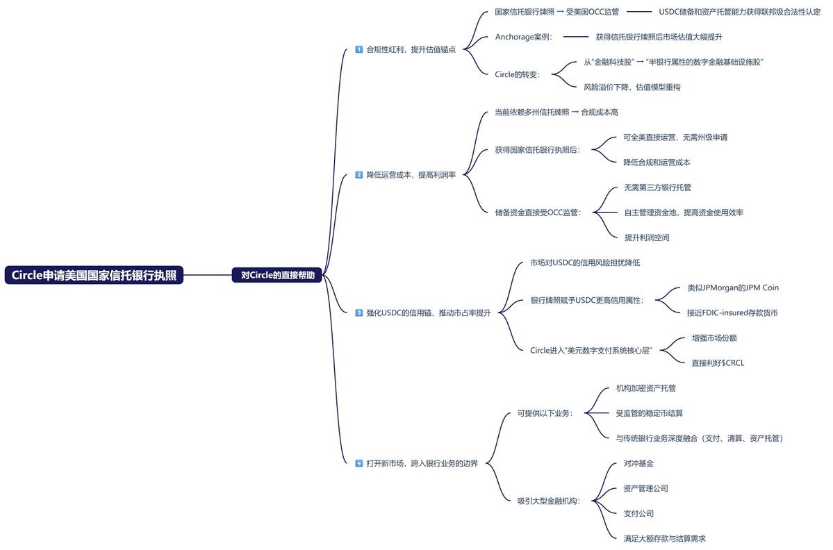 本质上对于 Circle 来说最大的好处就是,它从一家合规做得比较好的稳定币发行公司,升级为被直接纳入美国联邦银行监管体系的金融基础设施节点。(目前还没有完全批准)