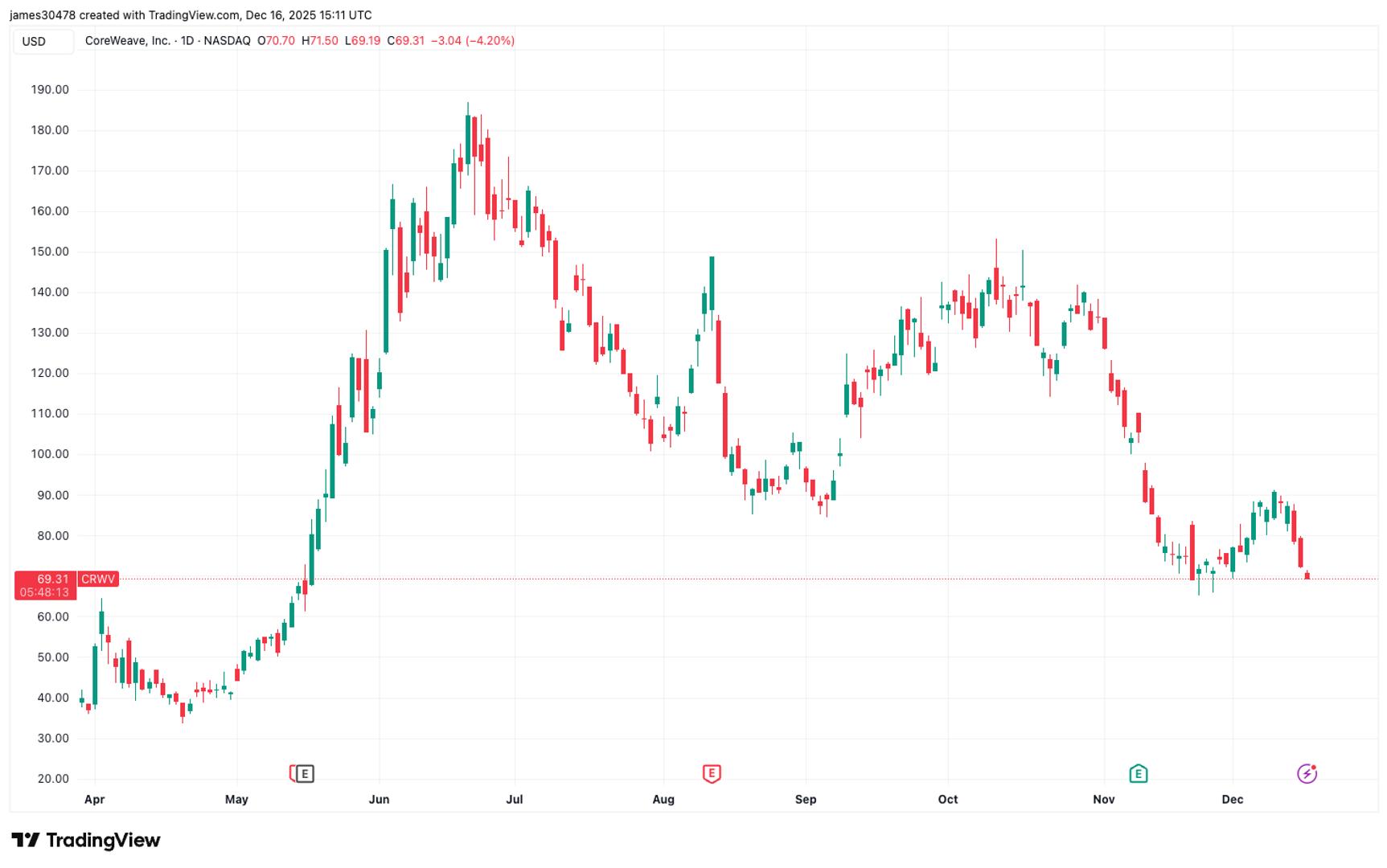CoreWeave shares have fallen a further 4% on Tuesday, trading below $70 for the first time since May.