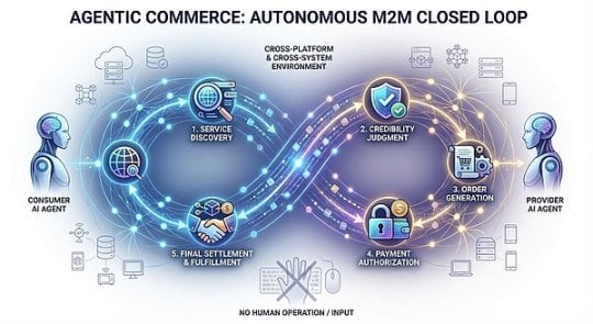 智能体商业(Agentic Commerce)指的是由 AI 智能体自主完成服务发现、可信度判断、订单生成、支付授权及最终结算的全流程商业体系。它不再依赖于人类逐步操作或信息输入,而是由智能体在跨平台、跨系统的环境中自动协作、下单、支付与履约,从而形成机器与机器之间自主执行的商业闭环(M2M Commerce)。