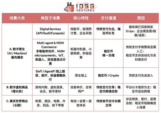 稳定币在现实商业无法规模化的核心障碍并非技术,而是监管(KYC/AML、税务、消费者保护)、商户会计(稳定币非法偿)以及不可逆支付带来的争议处理机制缺失。由于这些结构性限制,稳定币短期难以进入医疗、航空、电商、政府、公用事业等高监管行业,其落地将主要集中在数字内容、跨境支付、Web3 原生服务与机器经济(M2M/IoT/Agent)等监管压力较低或链上原生的场景,这也正是 Web3 原生的智能体商业最先实现规模突破的机会窗口。