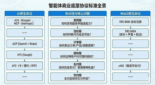 围绕智能体商业(Agentic Commerce)服务发现、信任判断、结构化下单、支付授权与最终结算这五个关键环节,Google、Anthropic、OpenAI、Stripe、Ethereum、Coinbase 等机构均在相应环节提出底层协议,从而共同构建出下一代 Agentic Commerce 核心协议栈。