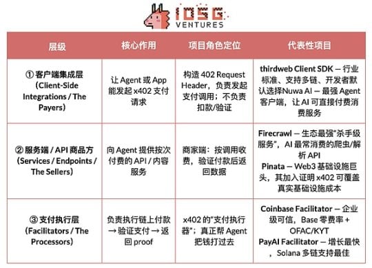 单纯在 Client 或 Service 端接入 x402 并不带来赛道溢价;真正具备增长潜力的是能沉淀长期复购与高频调用的上层资产,如 OS 级 Agent 客户端、机器人 /IoT 钱包及高价值 API 服务(市场数据、GPU 推理、现实任务执行等)。