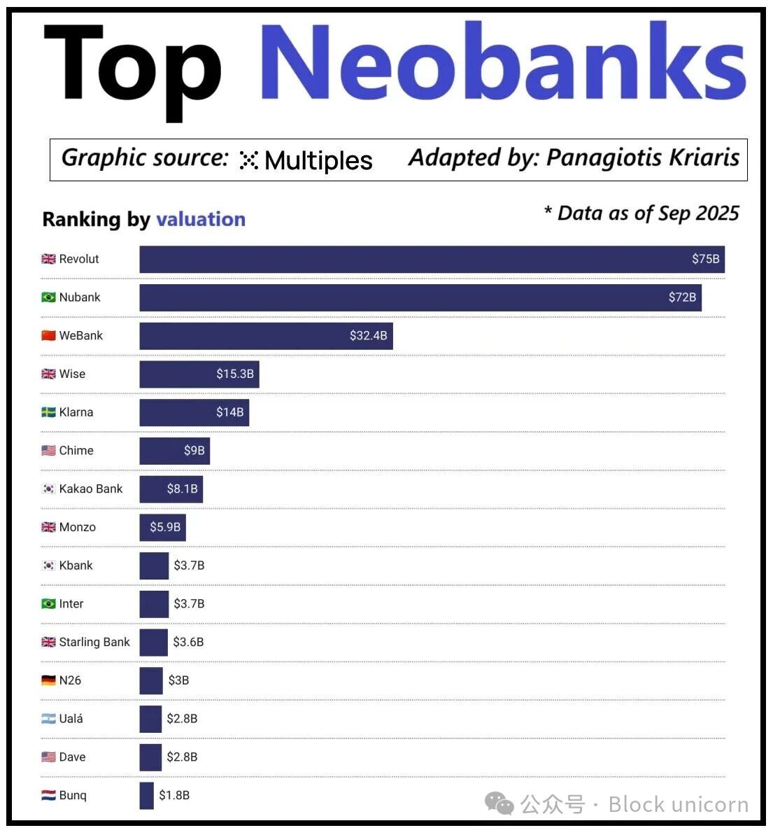 纵观全球最大的几家新兴银行,最有价值的并非一定是拥有最多客户的银行,而是那些能够从每位客户身上获得可观收益的银行。Revolut 就是一个典型的例子。它的客户数量少于 Nubank,但估值却更高,因为它的盈利模式涵盖外汇、交易、财富管理和高端服务等多个领域。而 Nubank 则通过持有信贷并收取利息而非依赖信用卡手续费来构建其庞大的业务。WeBank的运营模式则截然不同,它通过极低的成本和直接融入腾讯生态系统来实现盈利。