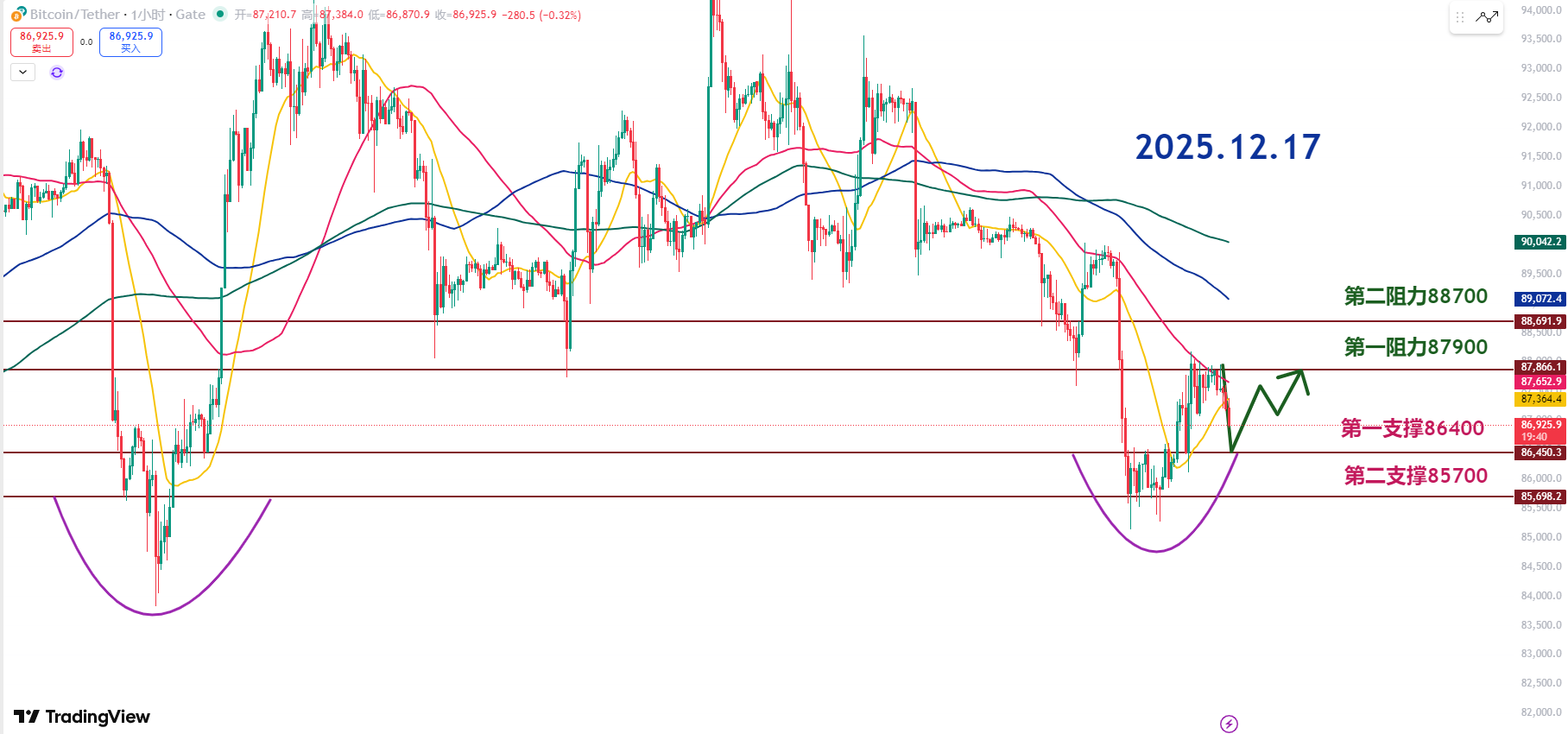 第一阻力87.9K,第二阻力88.7K。88K附近是强压,是昨天收盘前的高点,也是行情转弱的起点。不放量别谈突破,量跟不上就是假动作。只有带量重新站稳,才有资格去看90K的重测。