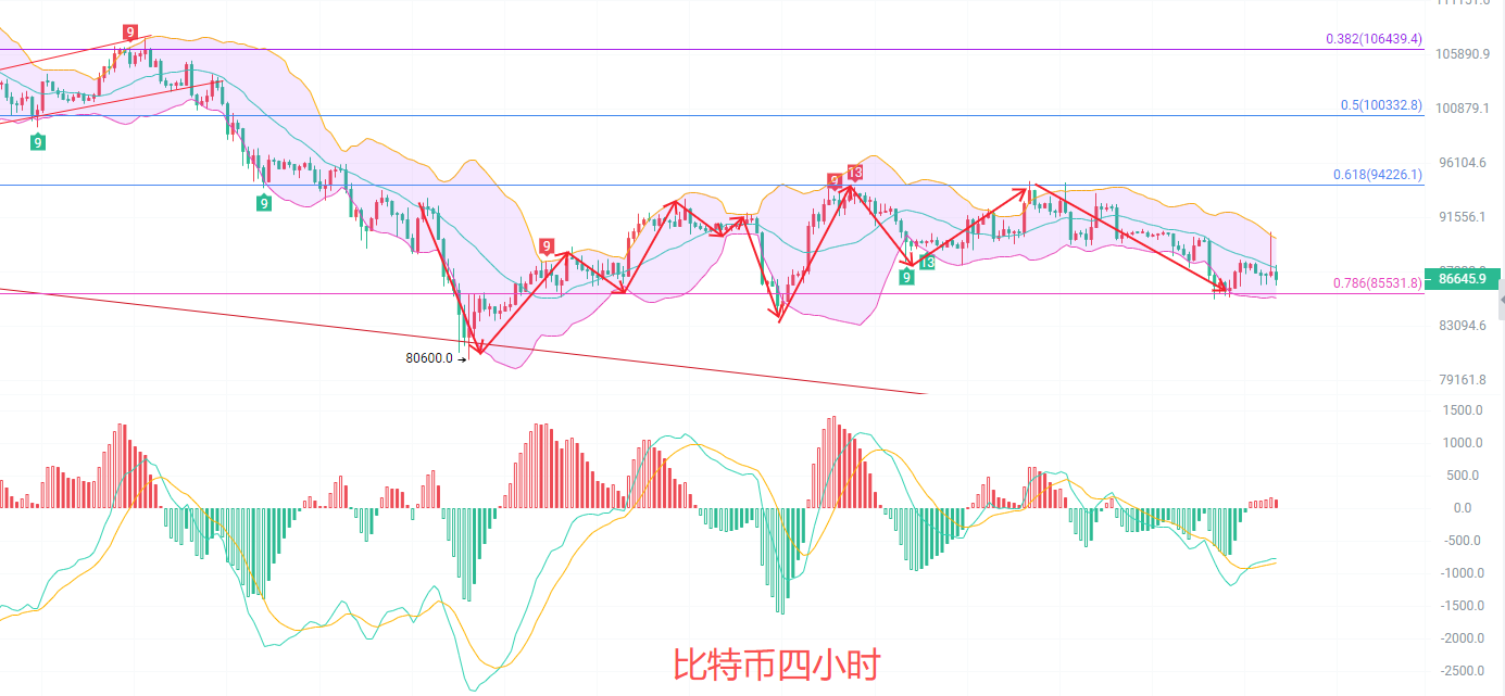 四小时K线出现了一个比较大的锤子线,向上冲击EMA趋势顶部阻力点90185,之后快跌跌破趋势指标,MACD放量延续,DIF和DEA收缩,短线指标只要守住了86000,那么死叉就不会成型,多头趋势就会延续,上轨关注9万,下轨参考85200,各项指标都是空势,奈何行情进入了中线级别支撑区域,有看北的需求,也算是进入了交易范围,那么不管指标看北还是看南,入场北上带好止损,