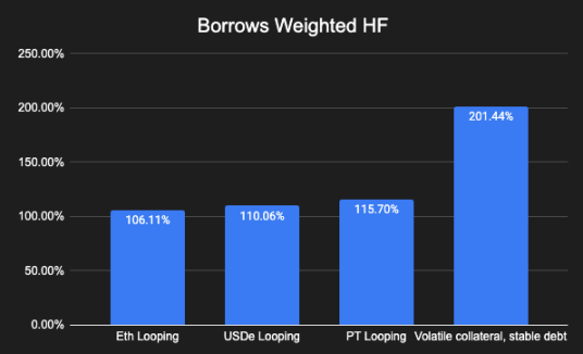 1、以生息 ETH 为抵押品,借入 WETH:质押 ETH 的收益率通常高于 WETH,这就形成了结构性基差交易(本质上是「借 WETH 还能获得收益」)。目前,这类交易占未偿贷款总额的 45%,且大部分资金来自少数「巨鲸」。这些钱包账户多与质押 ETH 发行方(如 EtherFi 平台)及其他「循环质押者」相关。该策略的风险在于 WETH 借贷成本可能骤升,这会迅速导致抵押健康度跌破清算线。