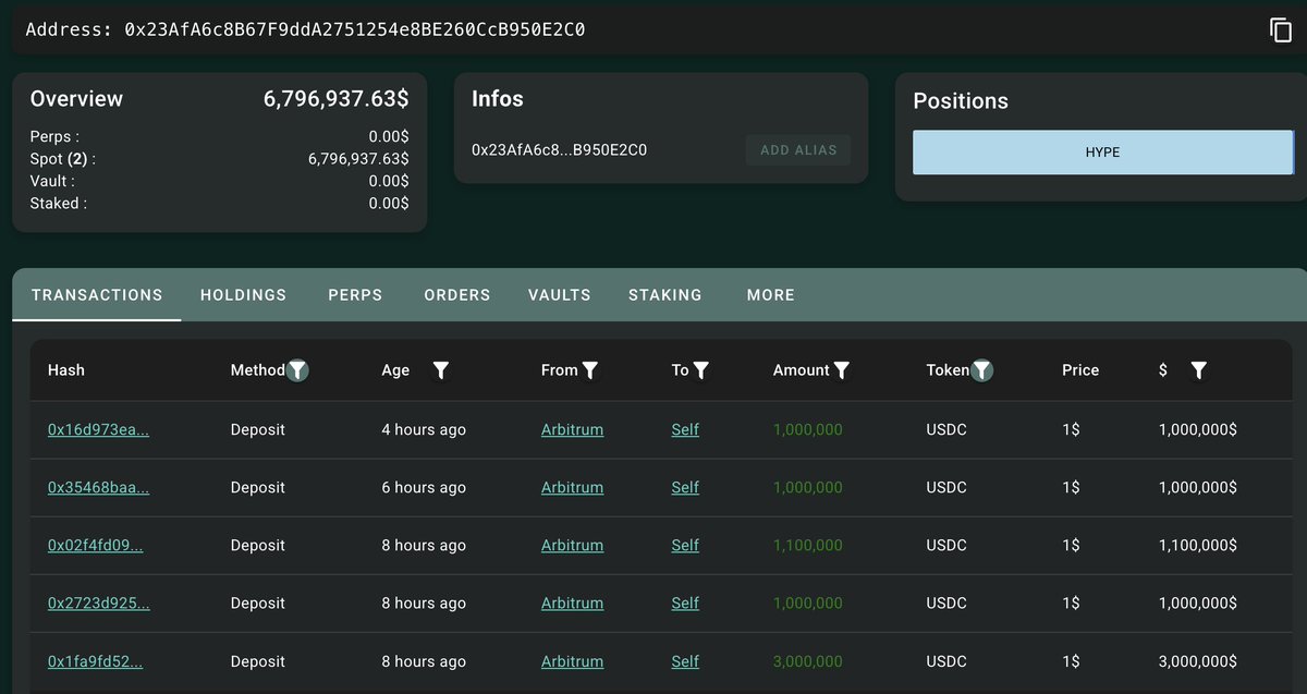 0x23Af deposited 7.1M $USDC into Hyperliquid to buy 277,420 $HYPE at $25.6.