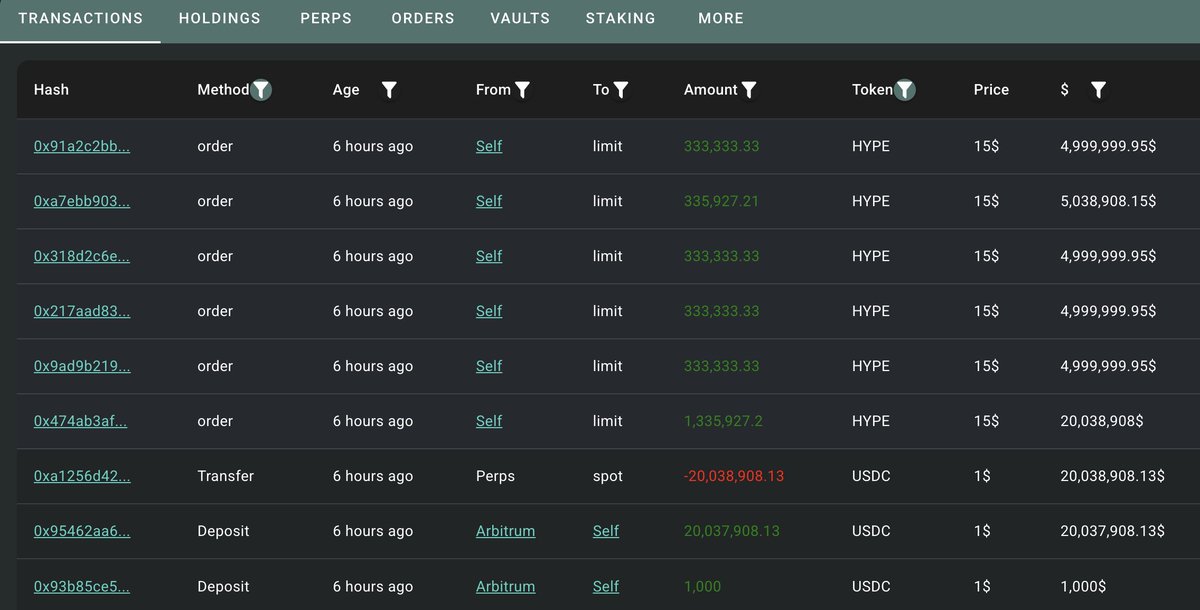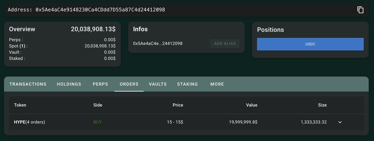 0x5Ae4 deposited 20M $USDC into Hyperliquid, placing limit buy orders at $15.