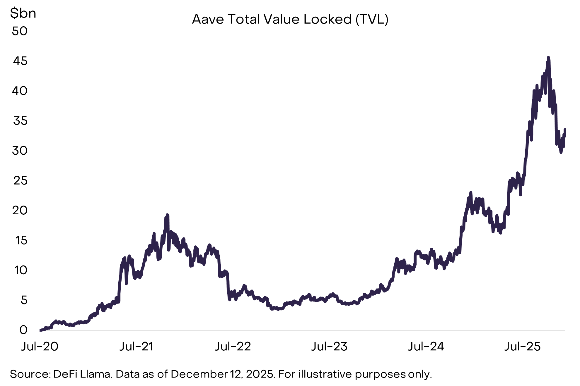 在技术进步和监管利好推动下,去中心化金融(DeFi)应用在2025年取得了显著发展。稳定币和代币化资产的增长是重要的成功案例,但 DeFi 借贷领域也实现了显著增长,尤其是由 Aave、Morpho 和 Maple Finance 主导的借贷平台(见图14)。[7] 与此同时,去中心化的永续期货交易所(如 Hyperliquid)在未平仓合约和日交易量方面,已能与一些最大的中心化衍生品交易所相媲美。展望未来,这些平台日益增长的流动性、互操作性以及与现实世界价格的联动,使 DeFi 成为希望直接在链上进行金融交易的用户的可信替代方案。预计未来会有更多的 DeFi 协议与传统金融科技公司整合,以借助其基础设施和现有用户群。我们预计,核心 DeFi 协议将从中受益,包括 AAVE 等借贷平台、UNI 和 HYPE 等去中心化交易所,以及 LINK 等相关基础设施,同时支持大部分 DeFi 活动的区块链(如 ETH、SOL、BASE)也将受益。