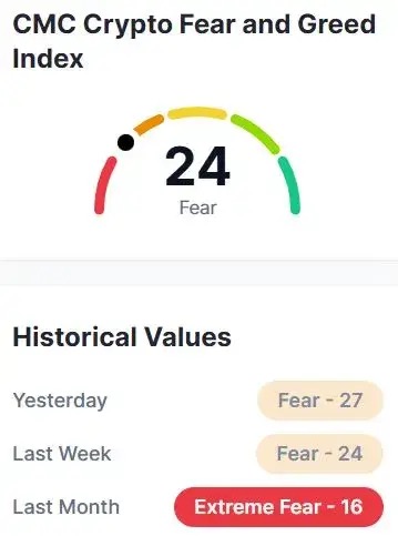 过去24小时,加密市场类似走钢丝。价格小幅走高,但信心明显增长。比特币和以太尝试缓慢攀升,但由于恐惧感悄然控制主导,交易员们的手始终紧扣在「卖出」键上。加密货币恐慌与贪婪指数(加密货币恐惧与贪婪指数)已暴跌至24,这并非是恐慌,而是一种深思熟虑的支撑。历史经验表明,这往往是重大行情的酝酿开始。