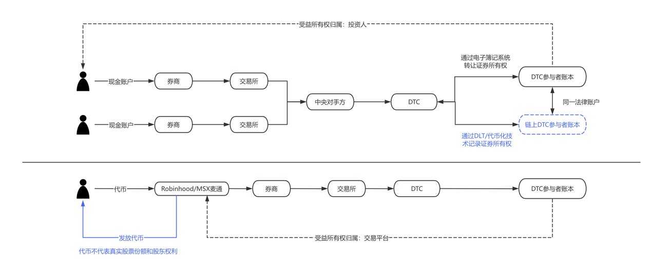 Currently, the custody bookkeeping of U.S. stocks operates in this manner: assuming a broker has an account with DTC, DTC uses a centralized system to record every buy and sell transaction of stocks and shares. This time, DTC proposed whether it could provide brokers with an option to record these stock holdings again using blockchain tokens.