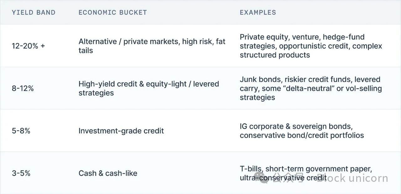 将这些投资组合上链并不会改变风险与回报之间的关系。在如今的 DeFi 前端,五种截然不同的风险等级可能都以同一张友好的广告形式呈现:「存入 USDC,赚取 X% 收益」,却几乎不会显示你承担的是现金、投资级信贷、垃圾级信贷、股票还是对冲基金的风险。