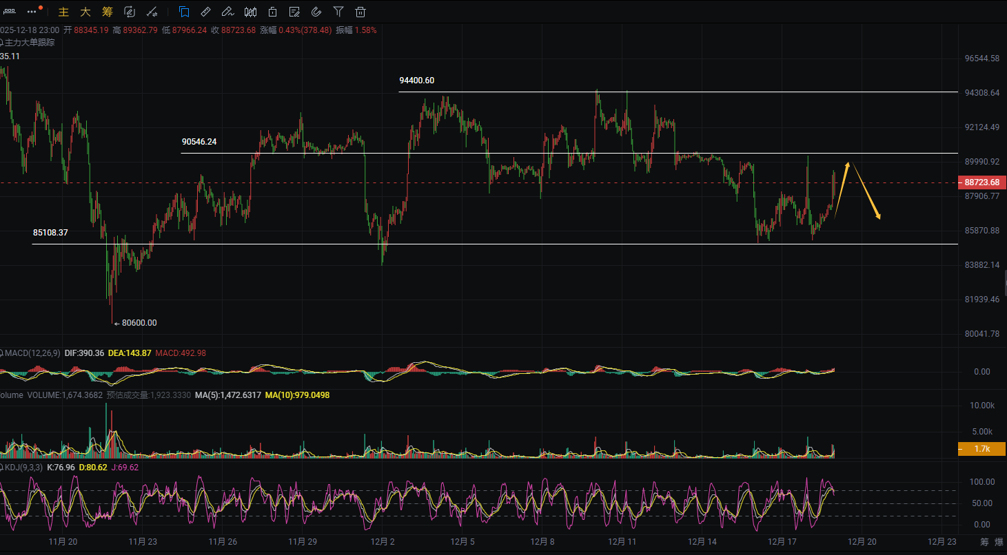 那么再来看看接下来的技术指标分析,大饼日线级别呈现连续反弹走势,12月16日至12月18日形成三连阳,整体偏多头趋势。技术指标小时级别MACD金叉后持续放量,多头动能增强;但当前DIF与DEA逐步靠近,需警惕短期调整风险。小时级别RSI处于64附近,未进入超买区域,仍有上行空间;日线级别RSI从低位回升至中性区域,趋势向好。小时级别EMA7、EMA30和EMA120均呈多头排列,价格运行在EMA7之上,短期支撑较强;但是上方9万整数关口短线存在压制,周内预计难有大涨空间,短线需留意此处回撤风险。