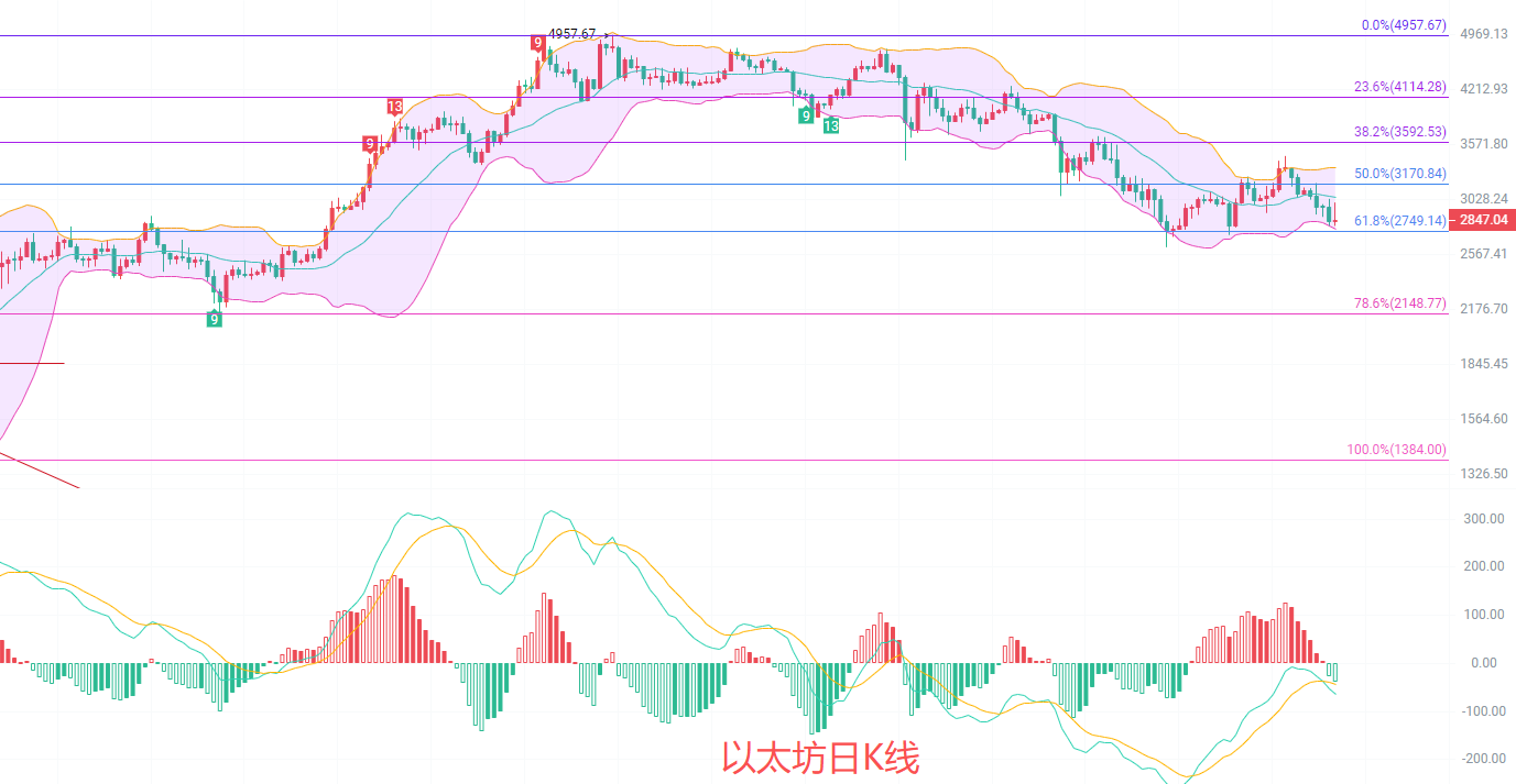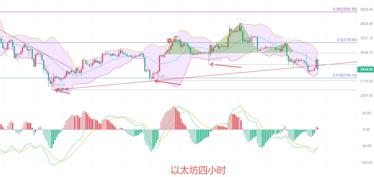 Before the publication, the daily K-line reached a high of 3000 and a low of 2790. The EMA trend indicator remains unchanged and is slowly declining. The bottom support to watch is the golden ratio line at 0.618, which is 2750. The resistance level to watch is at 0.5, which is 3170. The MACD shows a decrease in volume and accumulation, with the DIF and DEA diverging downwards, forming a death cross, indicating a strong bearish trend. The K-line is at the lower Bollinger Band support of 2770, with the middle band at 3050. The mid-level has entered extreme oversold territory, indicating a demand for a rebound, so 2800 northward is valid.