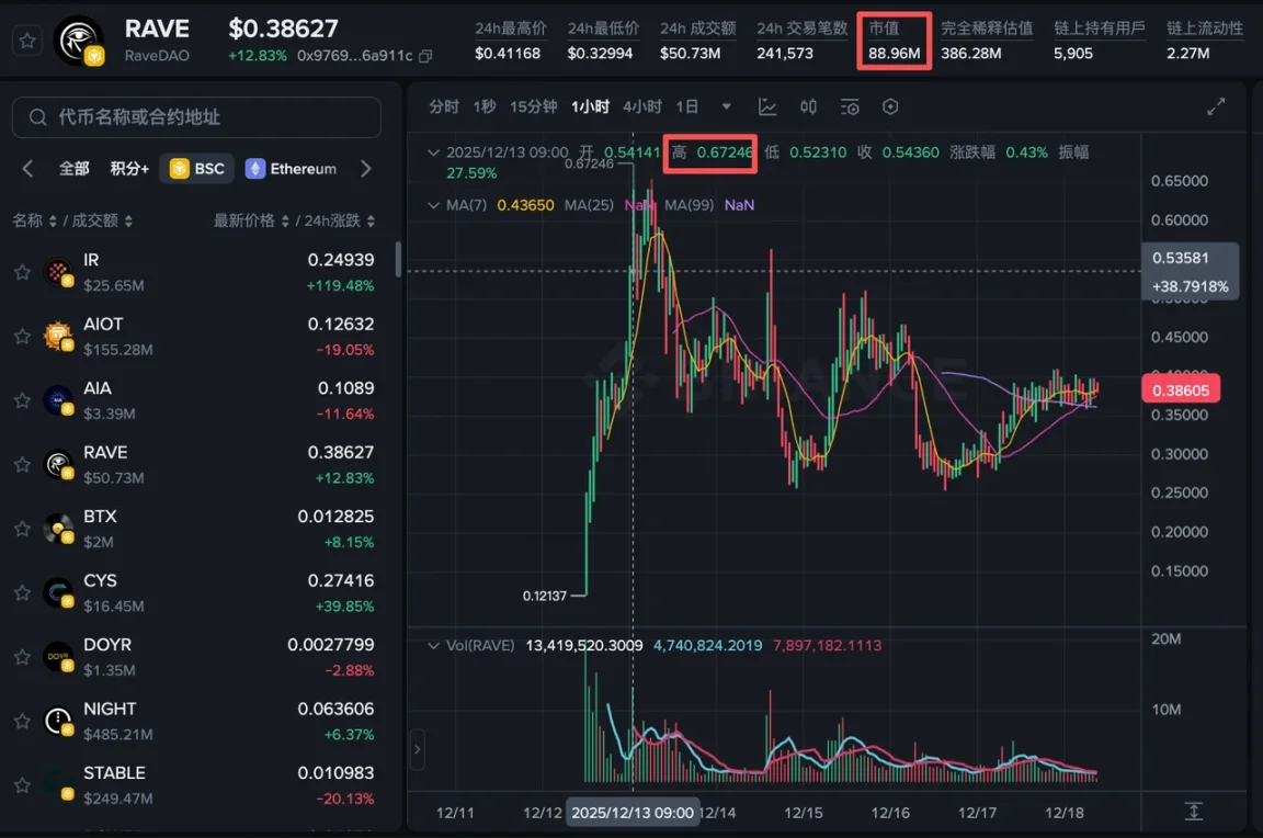 • 12 月 13 日,RAVE 价格一度触及 0.67 美元,24 小时涨幅超 410%;