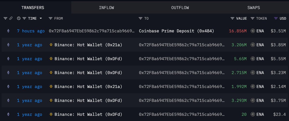 鲸鱼 0x72F8 在 7 小时前将全部 1686 万 $ENA 存入 Coinbase Prime。