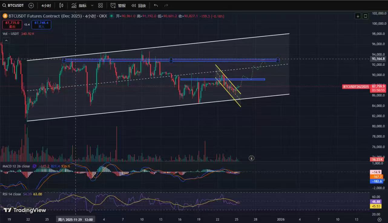大饼周线仍处于横盘震荡区间,周线仍未确认方向,等待有效突破;上方压力:94000(矩形上沿+趋势压制),下方支撑:85000(上升趋势线);日线昨日收下影线阳线,有止跌迹象,但近期反弹量能不足,上方压力明显,总体方向价格仍在上升通道下轨附近运行,上方压力区间:88900-91200,若跌破84000下轨,下行趋势延续;MACD金叉但动能减弱,RSI金叉;短线级别关注4小时,短线机会伺机而动;