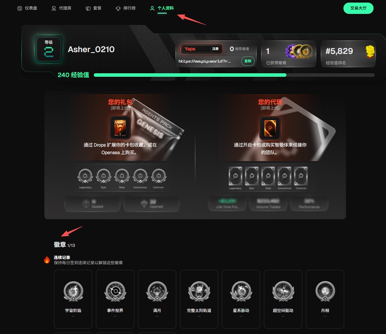 STEP 5. Click "Profile," scroll down the page to view badge unlocking status, including tasks such as continuous sign-ins and product experiences.