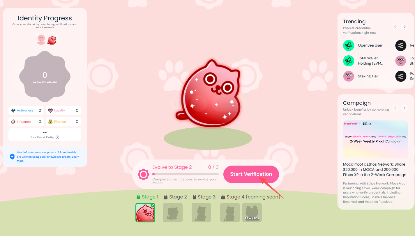 Each user will have a pet named Mocat. The more types and quantities of verifications passed, the more points earned, and the higher the level of Mocat, unlocking more rewards.