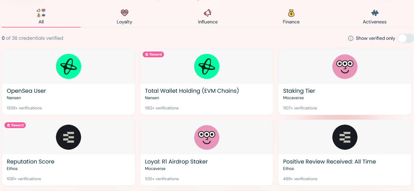 STEP 3. Click "Start Verification" to begin verification tasks. Currently, verifiable tasks include: asset and staking-related, blue-chip NFT holdings, active Opensea users, addresses marked by Nansen, and addresses related to Ethos and Cookie3 activities.