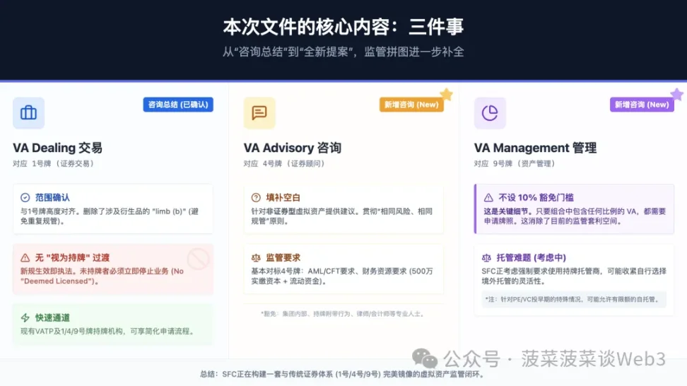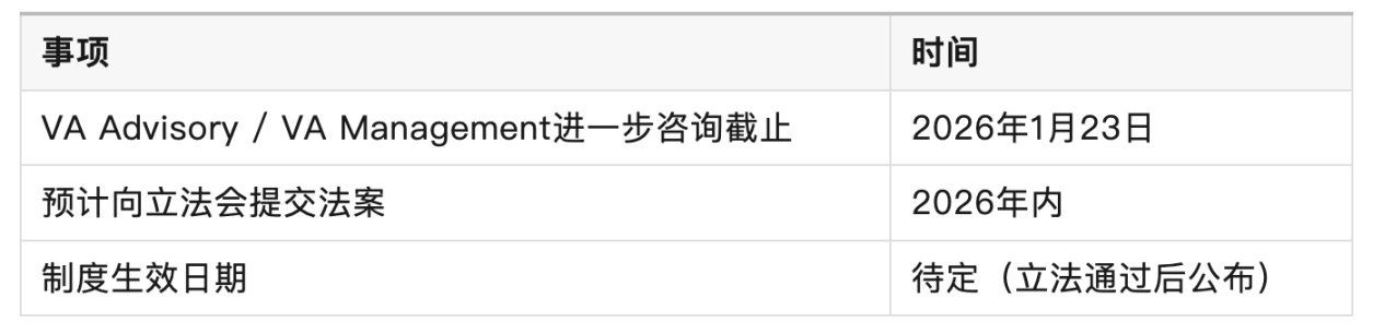 In December 2025, the Hong Kong Financial Services and the Treasury Bureau and the Securities and Futures Commission jointly released an important document. The document is divided into two parts: one is a consultation summary regarding the licensing system for VA trading services (VA Dealing), and the other is a further public consultation on VA advisory services and VA asset management services.