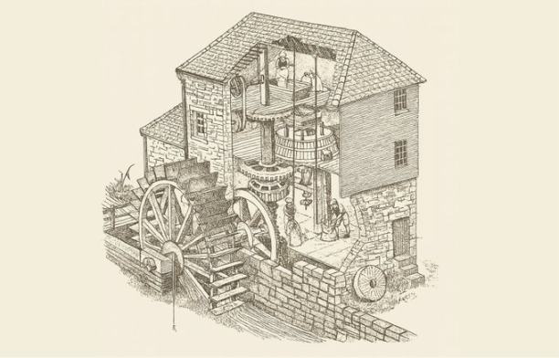 Water-powered mills. Hydropower is strong but unstable and limited by location and season.