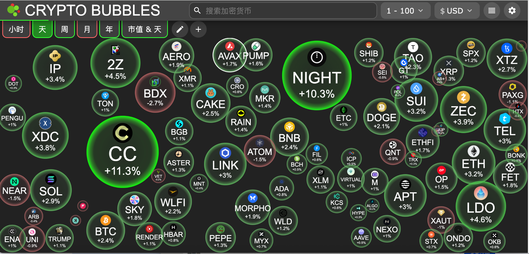 今日市值前100币种最大涨幅:Canton Network涨11.3%、Midnight涨10.3%、DoubleZero涨4.7%、Lido DAO涨4.5%、Zcash涨3.9%。