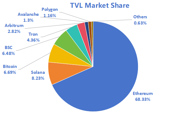 By public chain, the top three chains by TVL are Ethereum, accounting for 68.33%; Solana, accounting for 8.23%; and Bitcoin, accounting for 6.69%.