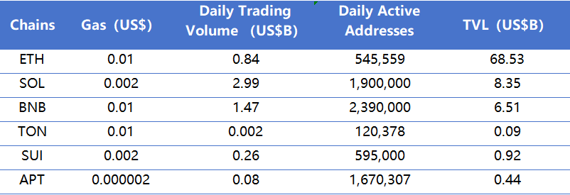 Mainly analyzing the daily trading volume of on-chain DEXs, daily active addresses, and transaction fees for the current major Layer 1s including ETH, SOL, BNB, TON, SUI, and APT.