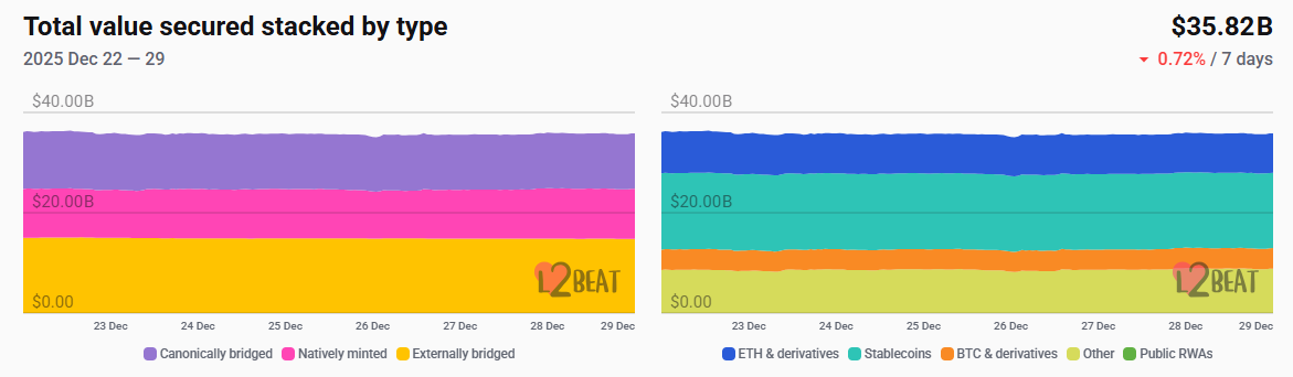 According to L2Beat, the total TVL of Ethereum Layer 2 is $35.82 billion, down from $36.24 billion last week, a decrease of approximately 0.72%.