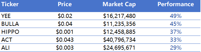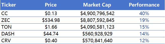 1. Top Five VC Coins and Meme Coins by Growth This Week
