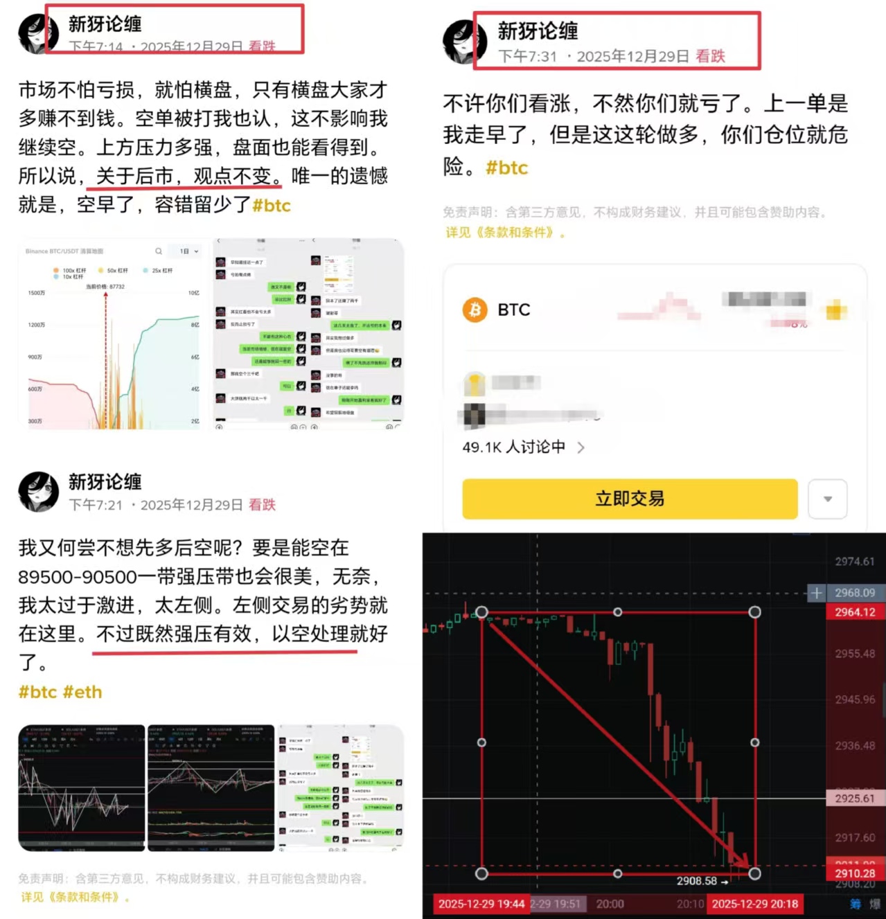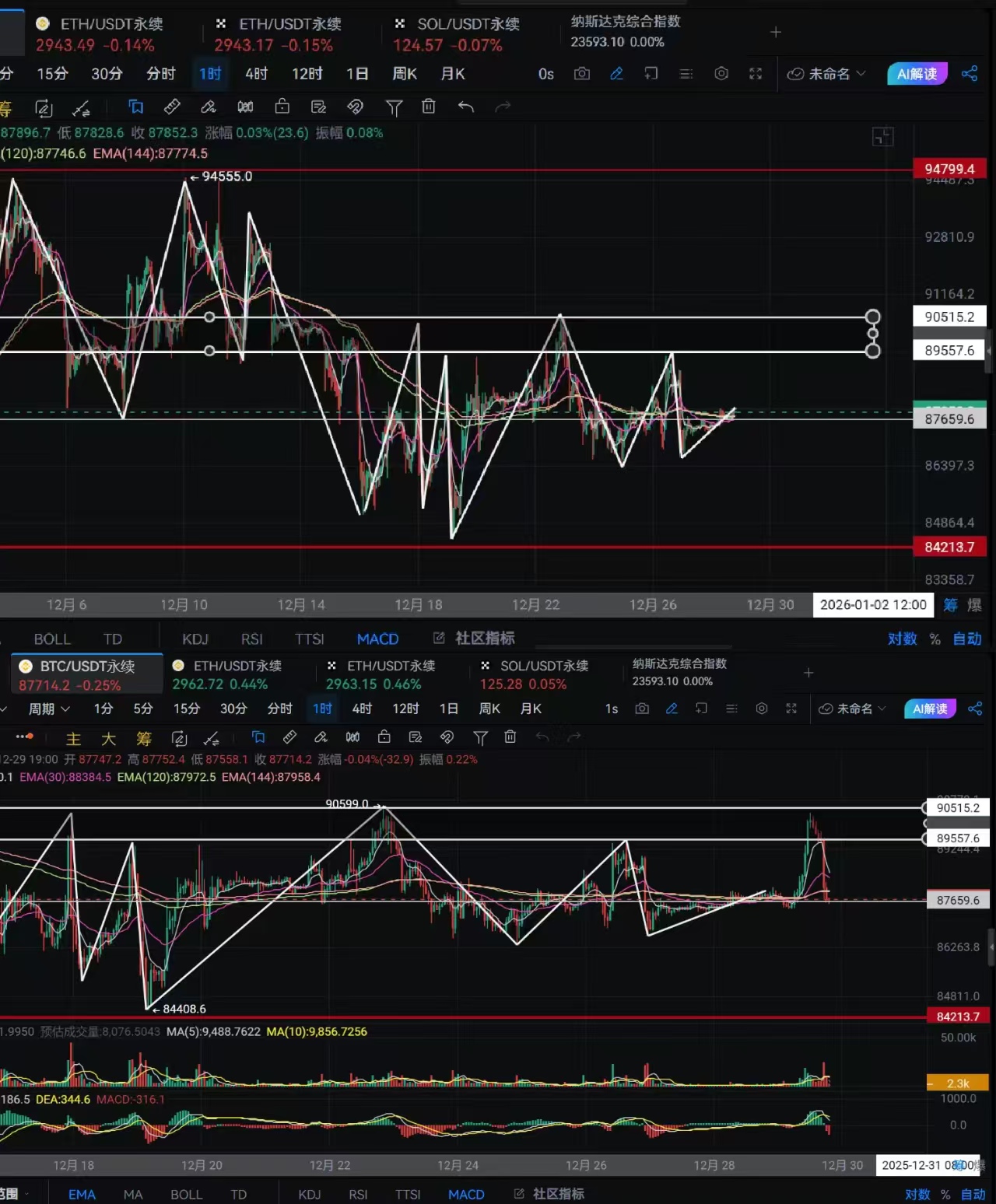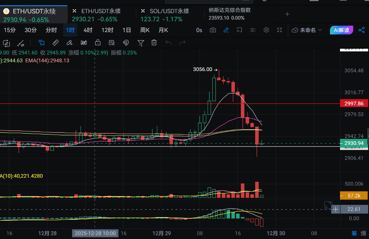 以太可以完全同步大饼节奏走。这一段以太走势完全被大饼带着在走,12月28日在围绕着一小时ema7,ema30,ema120,ema144窄幅震荡,完全是被大饼节奏带上去的。拉升推高到3056,低于十二月下旬的3077,且下跌未回头,当前一小时已经九连空头排列。我们保守可以在第二段施压点2950空单进场,3000直接大补。下方看刷一段低位,先看2830-2850一带