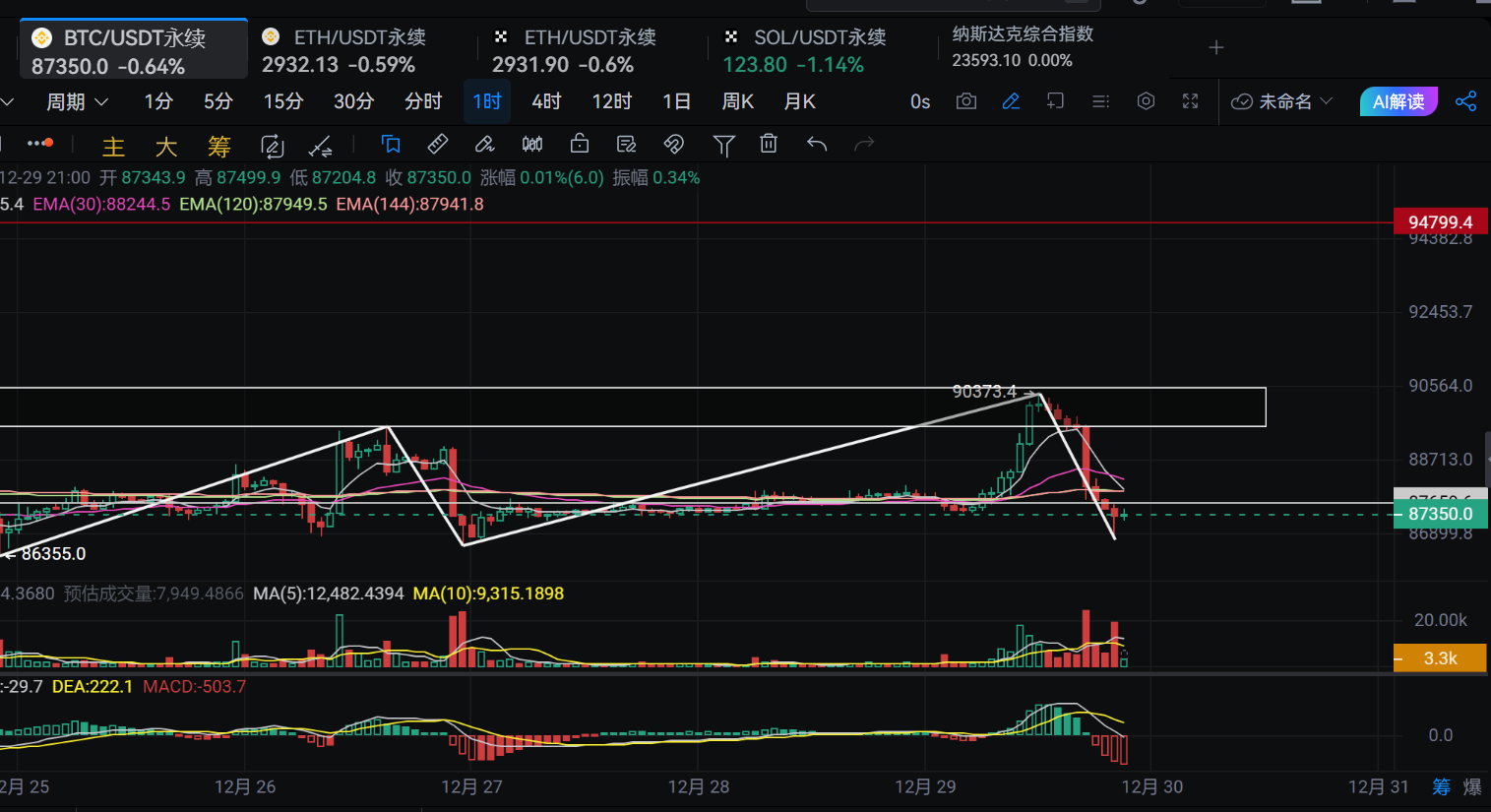 当前四小时ema120以及144分别在88500,88800一带,而一小时ema7均线已经被压回来,到了ema144相汇于87950一带。小级别还在犹豫,需要观察资金动向,大的级别不动如山,雷打不动的挡在那里。