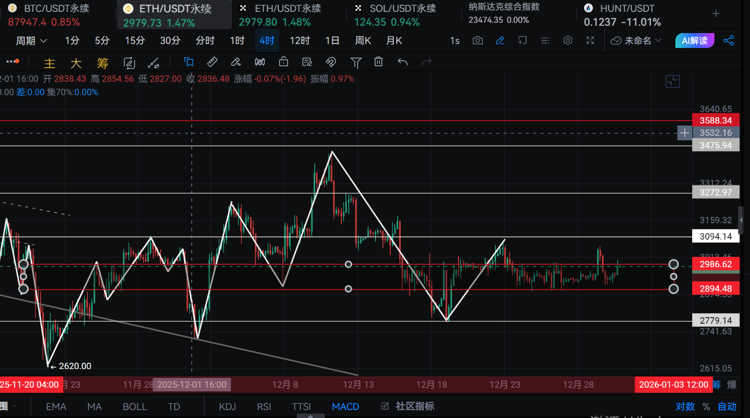 The trend of Ethereum is relatively more urgent than Bitcoin. The rise at 4 PM, from the one-hour EMA 7, 30, 120, and 144 crossover point at 2950, jumped above 3000, rising much stronger than Bitcoin. After the closing candle, it has been consolidating in a narrow range around 2972-2988 for four hours. The one-hour MACD energy is slowing down, but the four-hour chart has just started, and the future may revolve around 3000 for contention.