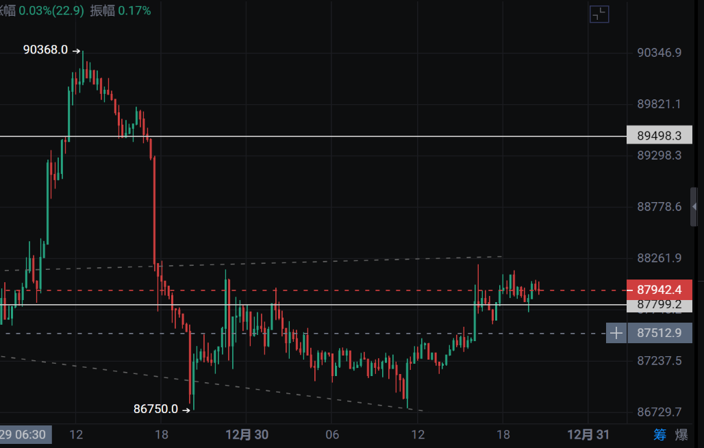 Let's first look at the intraday trend. Bitcoin is fluctuating in the range of 86800-88200. The rise during the night session on the 29th and the rebound at 2 AM were both suppressed. The price retested around 86800 during the afternoon, showing buying support. Starting from 1 PM, the one-hour MACD has already crossed above the zero line, and the price is running at the one-hour EMA 120 and EMA 144, where there is significant resistance around 87800. Currently, the four-hour chart has shown four consecutive bullish candles, and the one-hour MACD fast line has been brought above the zero line. The future trend will depend on the performance in the range of 87800-88500. The strong resistance remains unchanged in the range of 89500-90500.