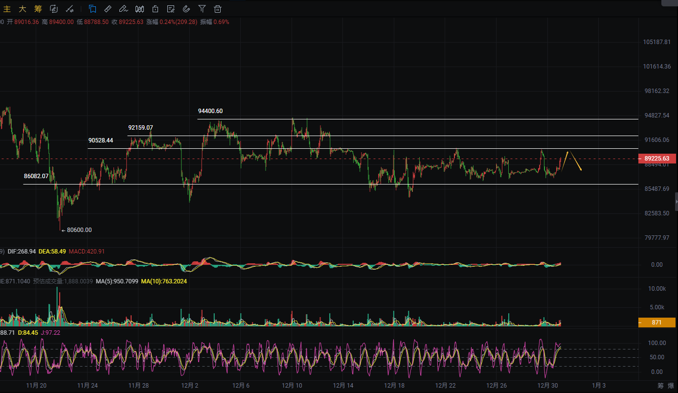 还是老样子说说技术面指标的走向,大饼日线昨日收阳,表明多头力量较强。小时线级别在12月30日22:00后连续收出高位震荡K线,最高触及89159附近,还未能突破89500,短期面临回调压力。技术指标小时线MACD柱状图逐步缩小,多头动能减弱;日线MACD仍处于零轴上方,趋势偏多。小时线RSI接近超买区(71.17),有回调风险;日线RSI为72.89,持续处于强势区域。小时线EMA7、EMA30和EMA120呈现多头排列,支撑分别在88508、87973附近;日线EMA均线系统同样保持多头结构。预计后半夜会继续受阻于90600压力之下走回落,操作上短线以这里为界做高空,下方以86500为支撑低多。