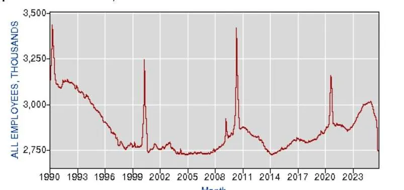 联邦员工成功削减27.1万人,降幅达9%,创下和平时期最大裁员纪录。但与此同时,联邦总支出不降反升,从2024年的6.75-7.135万亿美元飙升至7.01-7.6万亿美元,净增2480-4800亿美元。这种"瘦身却增重"的现象,正是DOGE(政府效率部)改革最核心的矛盾。