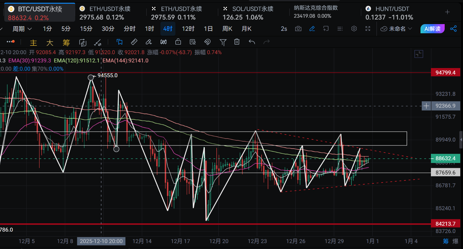 The overall view can be slightly adjusted based on yesterday's thoughts. For Bitcoin, pay close attention to the area around 89500 above and 87500 below. For Ethereum, focus on the 3000 level above and the 2930-2950 range below. Following yesterday's movements, the current state should be proactive. If heavily invested, consider reducing positions appropriately, and it’s best to allocate some for the New Year.