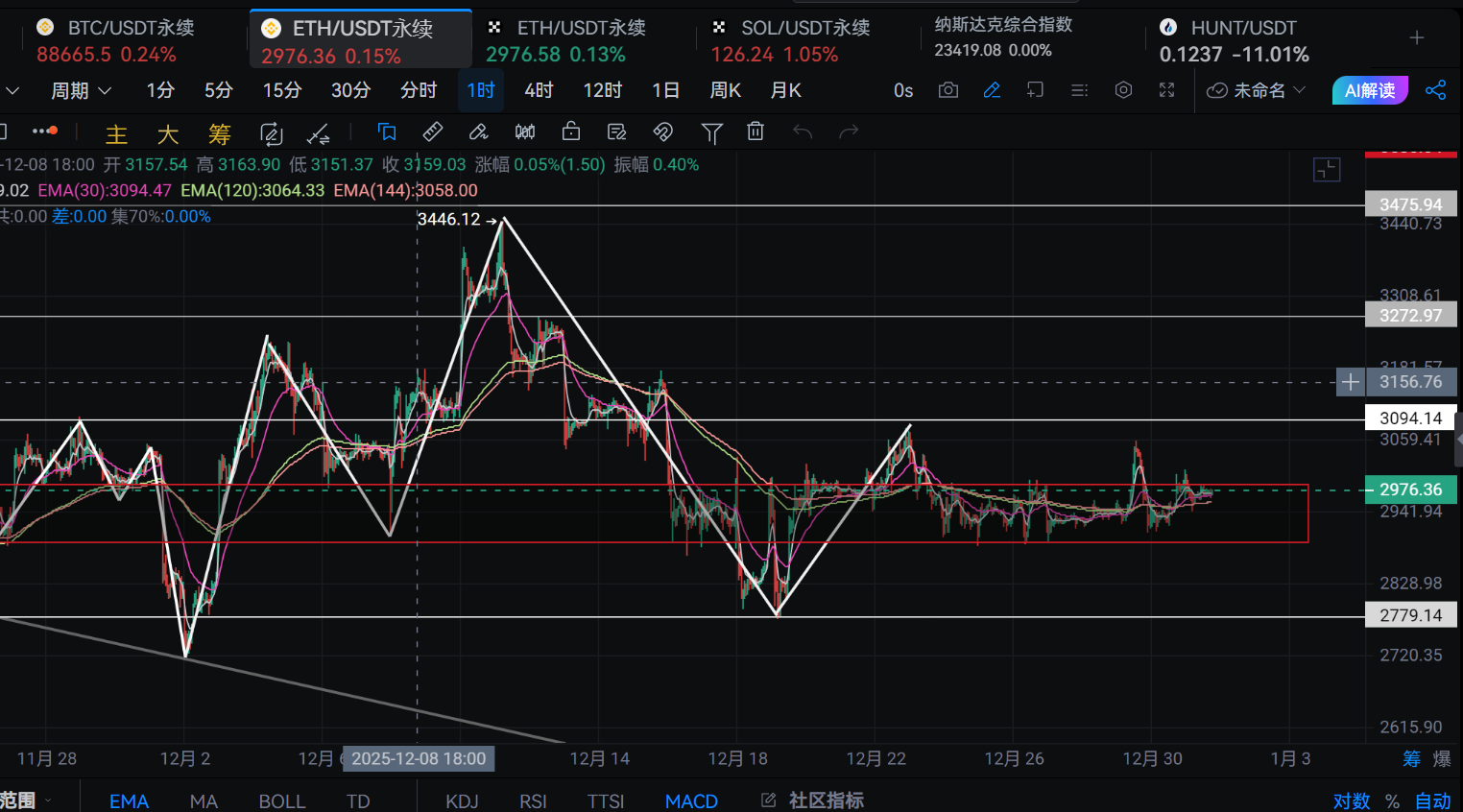 Ethereum's volatility is relatively larger. At 10:30 PM on the 30th, it retraced to the 15-minute EMA 120 and 144, rebounding from 2958 and briefly breaking 3000, but was immediately suppressed back to 2968. The last five hourly candlesticks formed a series of bearish patterns, with Ethereum dipping to around 2940, while the solid line closed at the current hourly EMA 120 and 144, 2955, and has been running above it since.
